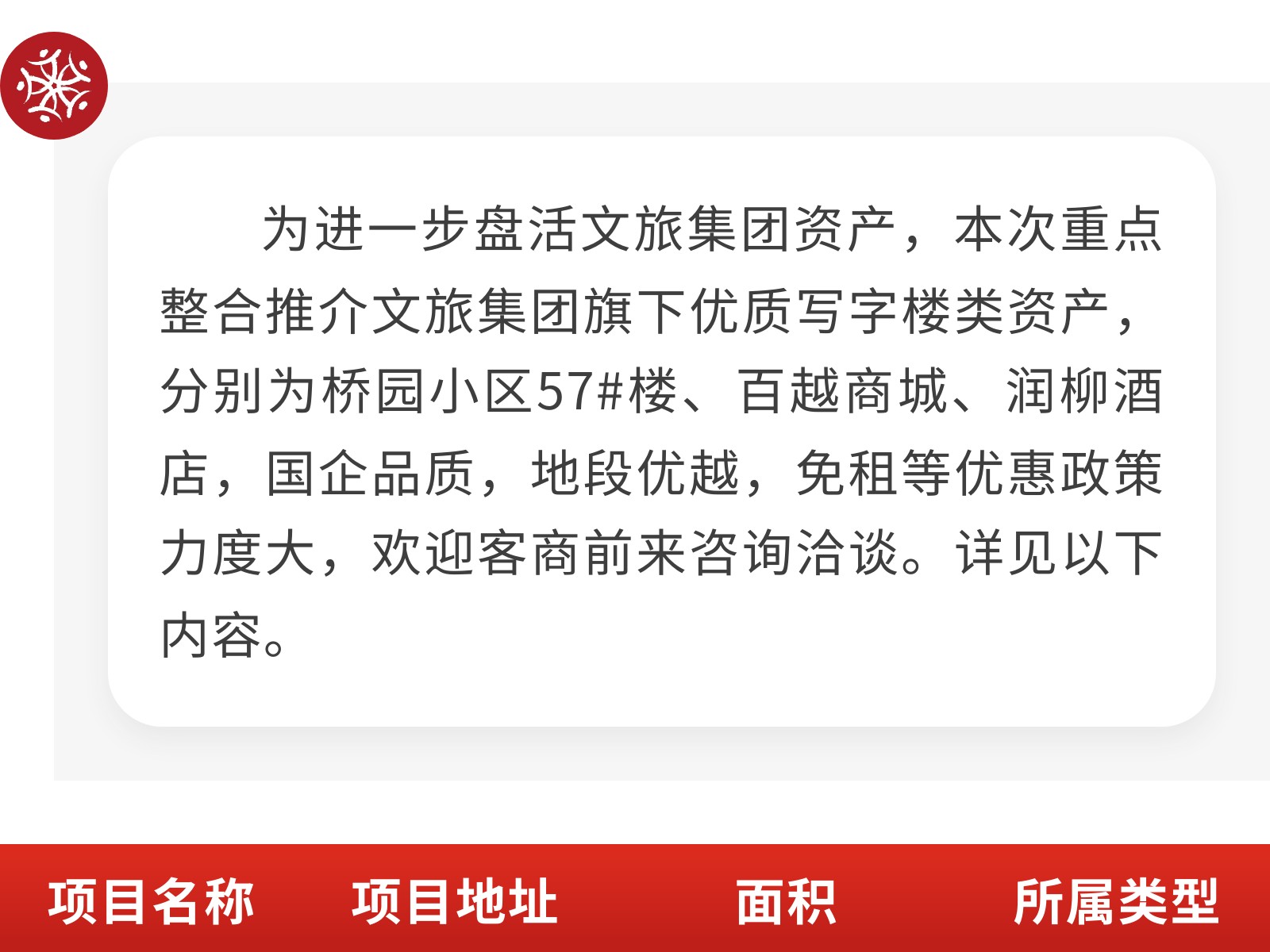 【國企品質(zhì) 誠邀共贏】文旅集團寫字樓類優(yōu)質(zhì)資產(chǎn)對外招租 發(fā)布時間:2025年09月28日 11時來源:本站原創(chuàng)瀏覽:19 人次